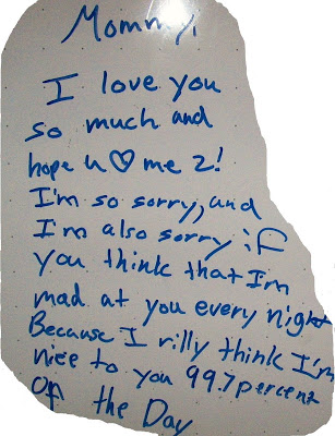 And my daughter, who tends to get stubborn (can’t imagine where she gets that from), and who has a hard time saying sorry (can’t imagine where she gets that from either), has used the whiteboard for this very reason. If ever we have a rough night, when I go to her room to check on her later, I often find her sound asleep with a note like this written on her board: