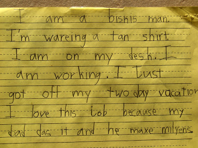 Oh that is hysterical. His writing seems very familiar to me :) What grade is he in? i love little kiddo spelling.