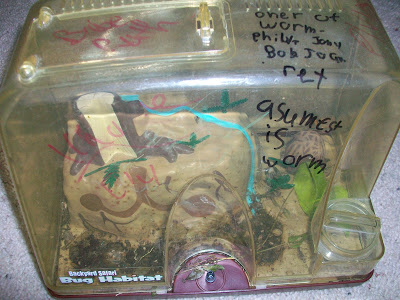 In case you can’t read his writing on the outside of the snail house, my son is the proud owner of Phillip Johnny Bob Joe Rex, “awesomest” worm (snail).