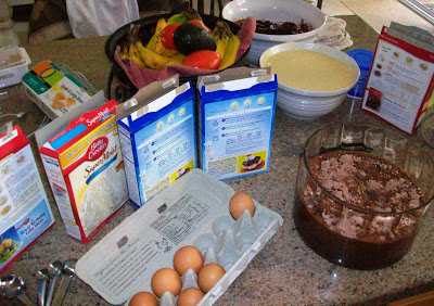 I came downstairs to find her working happily in the kitchen, three different bowls of ingredients going on at once, and five (FIVE) boxes of cake and brownie mix open.