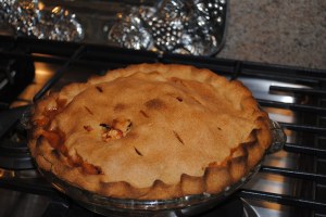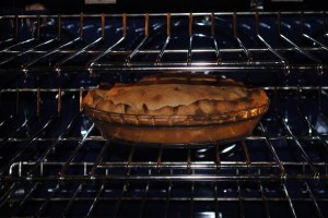 Bake at 450 for 15 minutes then reduce heat to 350 and bake an additional 40-50 minutes. (Note: when the pie is done, the crust will be darker and less flaky than your traditional pie crust, due to the flour used, but it still tastes great.)