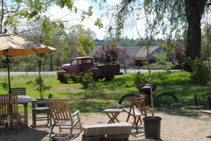 (In case you can’t tell, that’s an upside-down mannequin in the pond, with red stockings on. And that’s the Bocce Ball court and the truck with eyes.)