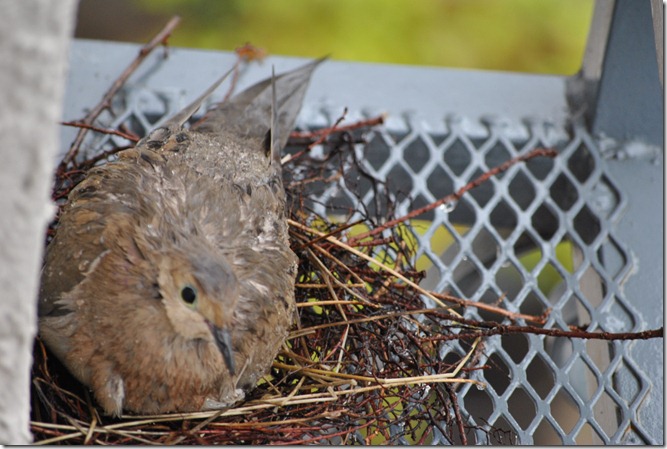 I don’t know if it’s the same bird we had on the balcony last year—the one who came and made her nest in the very same corner—or if it’s a different one this time. But either way, it breaks our hearts to see her sitting there, wet.